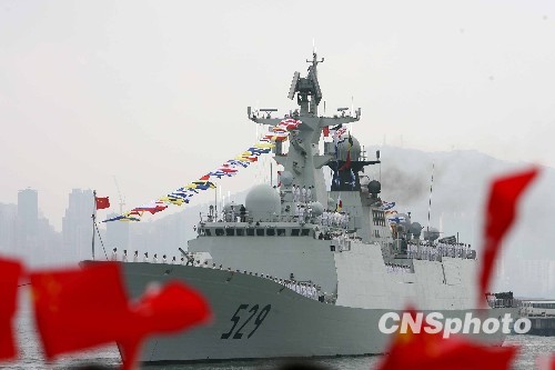中国人民解放军海军529护航编队两艘舰艇舟山号及徐州号进入香港停靠昂船洲海军基地。中新社发 洪少葵 摄