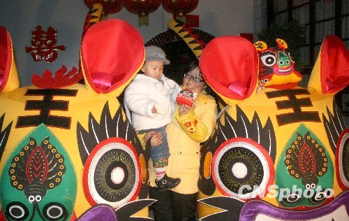 12月13日,由山东博兴县湖滨镇鲁刘村民间“布老虎”制作艺人制作的两只巨型“布老虎”正式亮相,吸引了众多参观者前来观看、合影。这两只巨型“布老虎”身高均为1.7米,身长2.2米,重500多斤,由当地3名民间“布老虎”制作艺人按照传统“布老虎”制作工艺,费时近一个月的时间联手制作完成,迎接即将到来的农历虎年。中新社发 陈 彬 摄