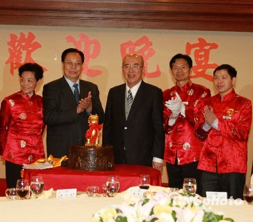 12月14日晚,正在台湾参访的河南省人大主任徐光春将客家人首个纪念器物“中原圣土望君归”001号被赠送给国民党荣誉主席、世界客属总会总会长吴伯雄。该器物由客家人祖根地河南省九个文化圣地之“土”和中华母亲河黄河之“水”融合而成。中新社发 赵勇 摄