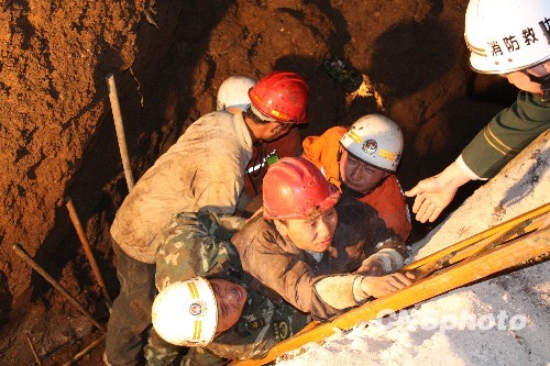 12月14日晚,贵州省六盘水市一建筑工地发生塌方事故,当时正在管道沟里作业的一名民工下半身被塌方的泥土掩埋,当地消防官兵接警后迅速赶到现场,不顾自身安危,用双手将埋压民工下半身周边的泥土一一刨出来。经过1个多小时的紧张救援,被困民工终于得救,送往医院救治。