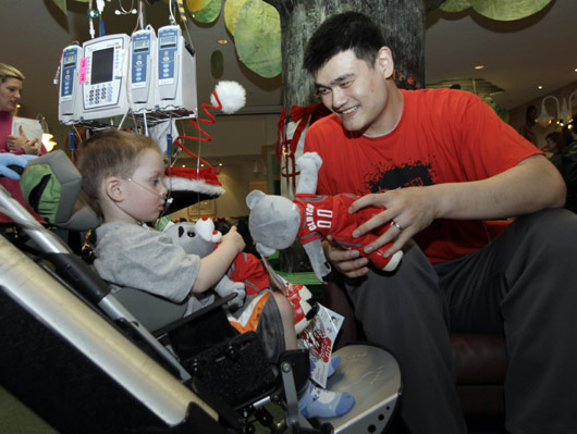 12月14日,美国休斯敦,姚明和几位休斯敦火箭的队友来到一家儿童医院看望患儿,并为孩子们送去礼物。