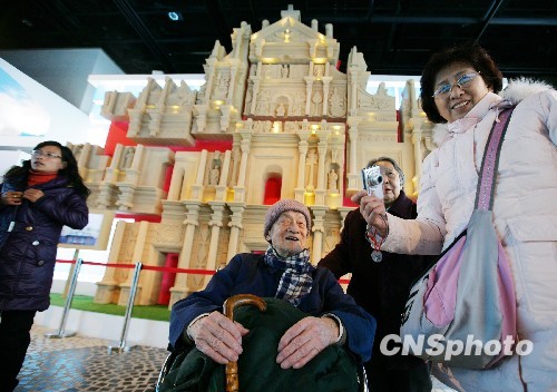 北京一家人在大三巴牌坊模型前合影留念。中新社发 刘震 摄
