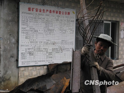 图为在现已废置的煤矿生产记录板前,工人正搬运最后一批设备。中新社发 刘贤 摄
