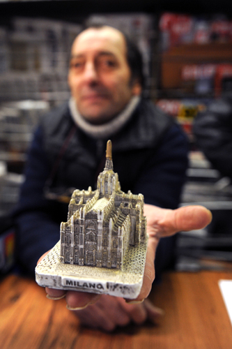 12月14日,在意大利米兰市中心一家纪念品商店,店主展示一个米兰大教堂的雕塑纪念品,这种雕塑纪念品成为摄影记者追拍的对象。13日晚,意大利男子马西莫·塔尔塔利亚用这种纪念品袭击了正在参加集会的意大利总理贝卢斯科尼的面部。