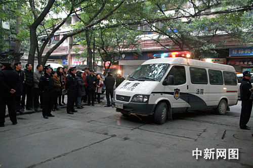 图为载着涉黑疑犯的警车开进法院。 银雪 摄