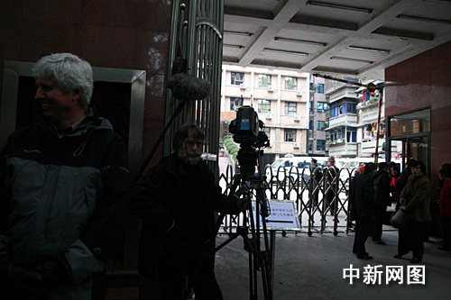 图为来自加拿大CBC电视台记者在法院门口等候。 银雪 摄
