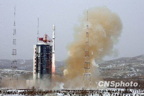 北京时间2009年12月15日10时31分,中国在太原卫星发射中心以一箭双星方式,用“长征四号丙”运载火箭将“中国遥感卫星八号”成功送入太空,搭载发射的中国首颗公益小卫星“希望一号”也顺利进入预定的太阳同步轨道。中新社发 尚春雅 摄