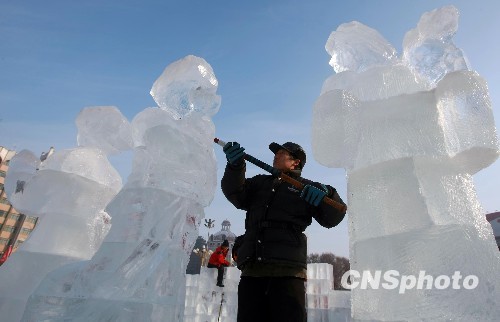 12月16日,新疆乌鲁木齐市人民广场,冰雕师傅正在抓紧时间雕刻一组表现新疆少数民族风情的大型冰雕作品。中新社发 刘新 摄