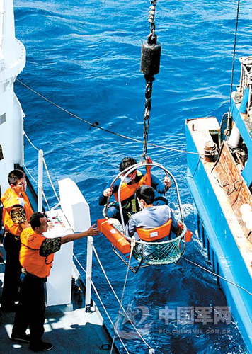在南沙永暑礁海域,医务人员用航空吊篮把患病渔民转运到“和平方舟”。张金明 摄