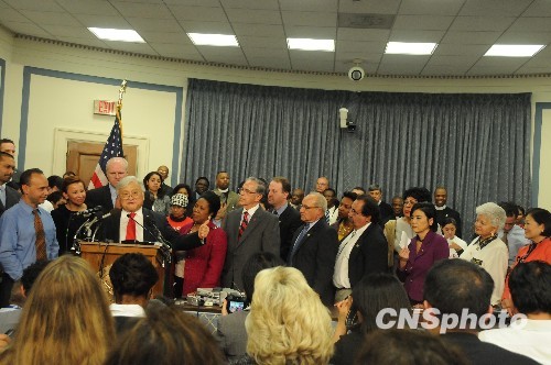 图为十五日的发布会获得包括国会亚太裔小组议员本田(发言者)、华裔议员赵美心(右三)等八十多位议员到场支持,并排队发言。中新社发 吴庆才 摄