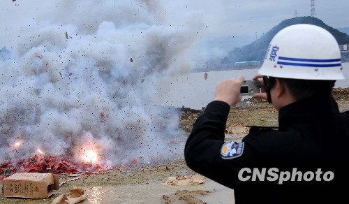 12月16日,福建福州仓山警方集中销毁查获的价值20万元非法储存烟花爆竹,这批烟花爆竹是警方于15日在辖区城门镇下洋村广福山附近的一个非法储存烟花爆竹的窝点内缴获的。临近岁末,福州警方加大力度对非法存放烟花爆竹的场所开展清查。