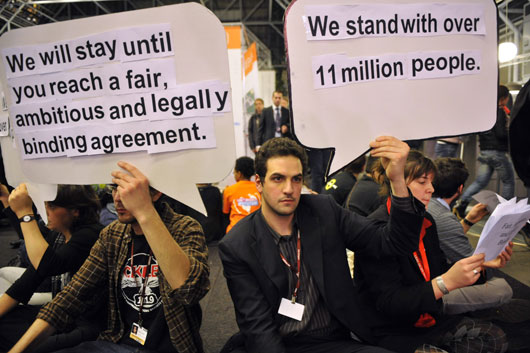 12月16日,哥本哈根,一群年轻人在贝拉中心静坐示威,要求联合国气候变化大会取得实质成果。