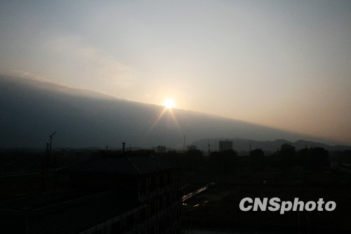 12月16日下午4时许,经历近半个多月的阴雨天气后,江西鄱阳湖上空突然一分为二,泾渭分明。一大片浓重的云彩整齐地自西向东铺过来,犹如一张巨大的毯子正在慢慢地覆盖天空,整个天空成为“阴阳脸”,直到日落仍未消失。