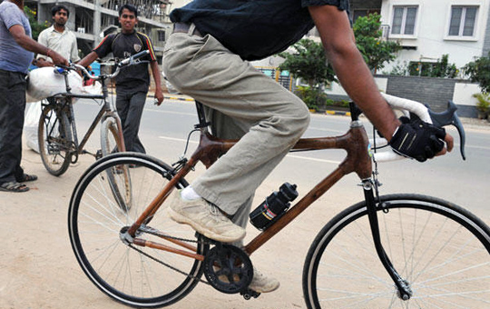 维贾伊·夏尔马在班加罗尔自己的车间里用竹子作骨架制造自行车。
