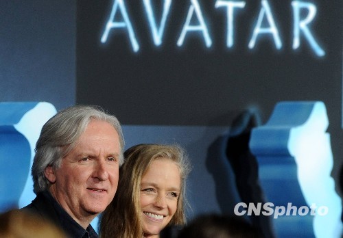 图为影片导演兼编剧詹姆斯·卡梅隆携妻子苏吉·埃米斯出席首映式。中新社发 张炜 摄