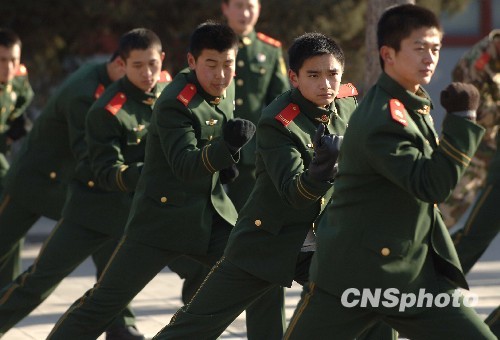 2009年12月17日,北京最高气温降至零下。北京天安门武警新兵,在故宫午门外露天练兵,强化军体拳和队列行进科目的训练,受游客关注。