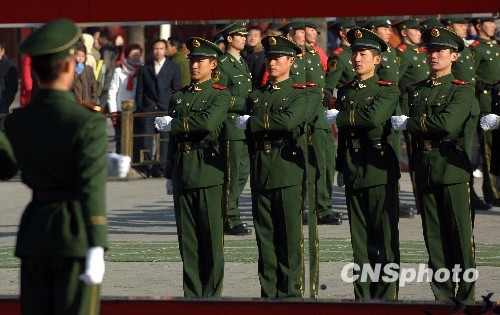 在天安门附近值勤的武警新兵,冒严寒对镜练兵。中新社发 邹宪 摄