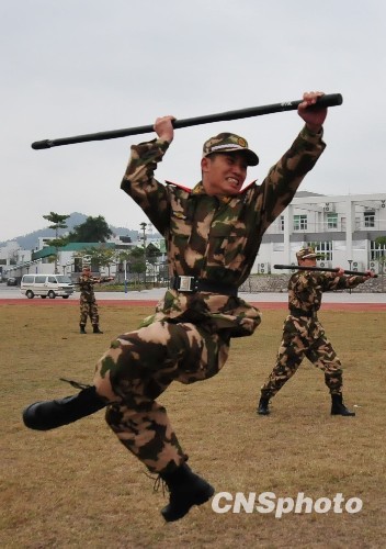 中山边防支队勤务中队官兵正在练习应急棍术。中新社发 李松林 摄