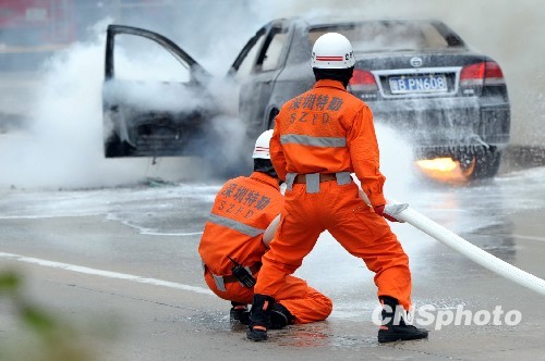 图:深圳一辆行驶小轿车燃烧起火(2)