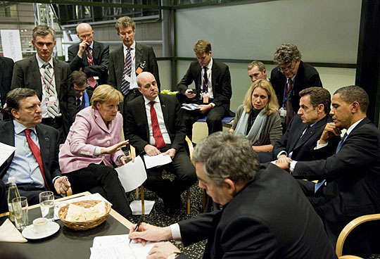 在丹麦首都哥本哈根,欧美各国领导人聚在一起进行分组讨论。