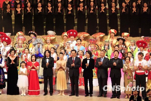 国家主席胡锦涛与演员一起唱响《歌唱祖国》。中新社发 张勤 摄