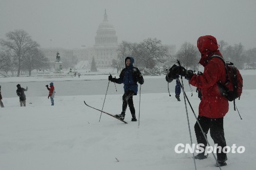 图为当日两名滑雪爱好者在华盛顿国会山附近滑雪。中新社发 吴庆才 摄