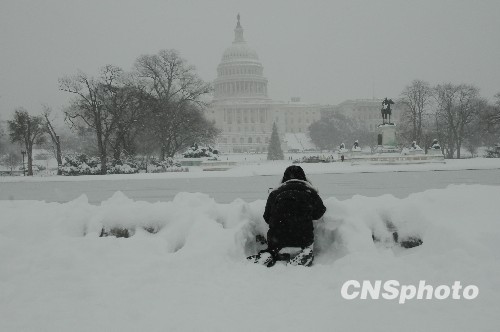 图为当日一名游客蹲在雪堆中拍摄华盛顿国会大厦。中新社发 吴庆才 摄