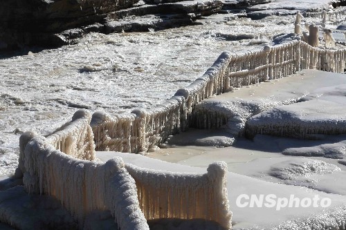 黄河壶口瀑布形成了各种各样的冰凌。中新社发 张旦 摄