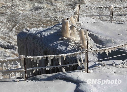 黄河壶口瀑布形成了各种各样的冰凌。中新社发 张旦 摄