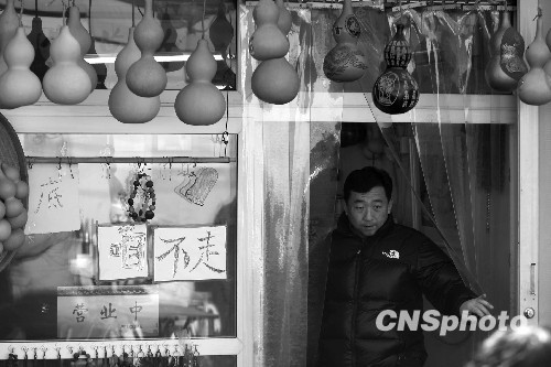 图为一家商户在窗户上打上了“咱不走”的字样,招揽生意。中新社发 富田 摄