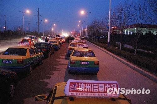 夜幕下等待加气的出租车在一加气站前排起长龙。中新社发 张滨 摄