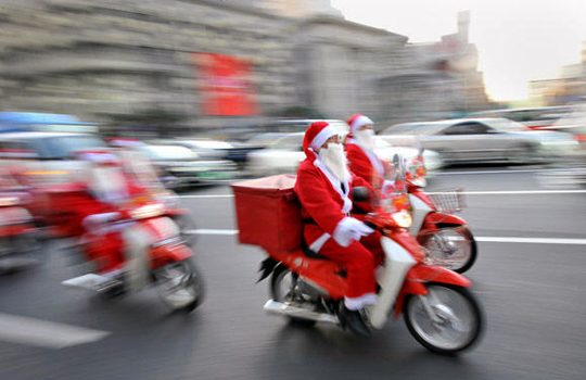 图为身着“圣诞老人”服饰的邮递员骑着摩托车去给穷人送礼物。
