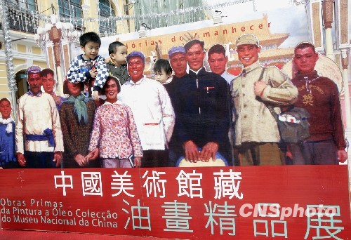十二月,中国美术馆藏油画精品展在澳门街头展出的巨幅宣传画,其时代特征的油画吸引了众多访澳游客拍照留念。中新社发 张勤 摄