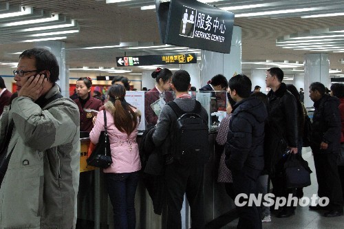 12月22日早晨,上海地铁1号线因为突发供电触网跳闸故障,造成1号线停运。在运营调整恢复中,两列列车发生侧面碰撞。图为大批乘客滞留,引发退票窗口繁忙。中新社发 汤彦俊 摄