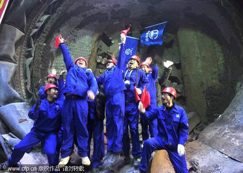隧道贯通后,工人们挥舞着手中的国旗,欢呼着拥抱在一起。