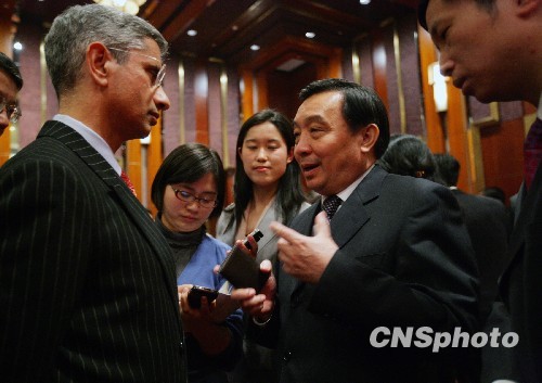 12月22日晚,国务院新闻办公室在北京举行2010年新年招待会,国务院新闻办公室主任王晨成为招待会的焦点,被前来参加晚宴的中外媒体记者包围采访。中新社发 刘震 摄