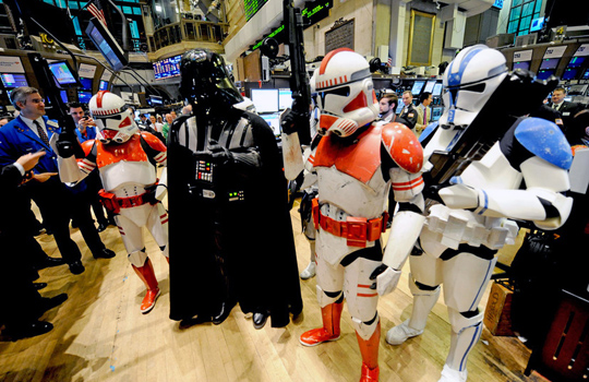 图为“战士“持枪在美国纽约证券交易所内穿行。