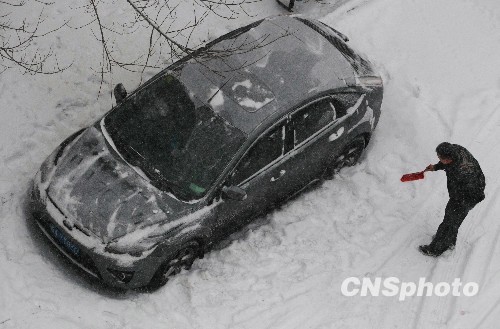 12月23日清晨,新疆乌鲁木齐一位市民为爱车清理积雪,准备出行。中新社发 刘新 摄