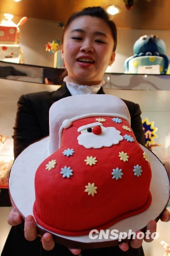 12月23日,重庆某蛋糕店店员展示以圣诞袜子为原型的蛋糕。据介绍,进入12月该店就推出了一系列圣诞蛋糕,随着节日临近,销量正持续走高。中新社发 胡虹 摄