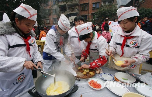 12月23日,重庆市永川区上游小学2009年家政体验节暨烹饪比赛在该校园举行,3至6年级的100名厨艺高手在同学们的加油声中,现场切菜、洗菜,然后烹制出一道道色香味美的菜肴。大赛旨在提高学生们的动手、动脑能力,让学生们在实践当中去感受、去成长。