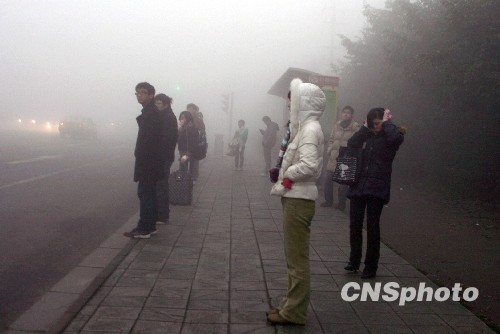 图为市民在浓雾中等公交车。中新社发 徐千舟 摄