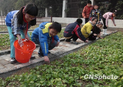 12月24日,安徽省合肥市青年路小学的学生正在校内的“小农场”里为蔬菜浇水。学校注重对学生进行环境教育,建设自然科学园,指导学生自己动手种菜、养鱼。中新社发 张娅子 摄
