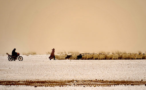 12月24日,受强冷空气影响,内蒙古自治区呼和浩特市、乌兰察布市、锡林郭勒盟等地相继出现大风沙尘降温天气,气温下降10至15摄氏度。图为两位牧民冒着风沙将羊群收拢赶回棚圈。 任军川 摄(图片来源:新华网)