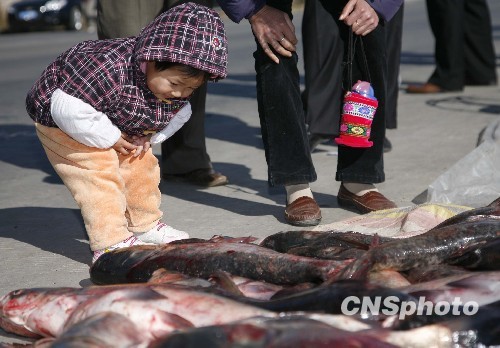 图为刚刚捕捞上岸的鲜鱼引起一名小朋友好奇的目光。中新社发 刘冉阳 摄