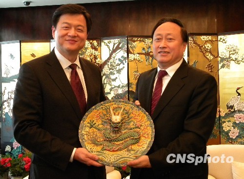十二月二十六日,中共南京市委书记朱善璐在南京紫金山庄会见台北县县长周锡玮所率的台北县参访团一行。会间,朱善璐向台北县访问团赠送题有“兄弟敦和睦,朋友笃信诚”的墨宝和高淳陶瓷,而周锡玮回赠了台湾著名的瓷器精品。中新社发 朱晓颖 摄