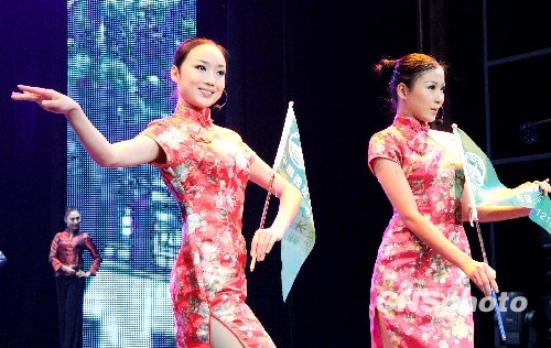 12月25日,一场主题为“迎世博 展形象”的“2009苏州市景区宾馆职业装展示大赛”总决赛在苏州科文中心热闹开赛。共有苏州城乡18支旅游景区和宾馆饭店的参赛队同台角逐,分别参加了以迎宾、客房、公关营销人员和园林景区、景点的售票、检票、讲解员等10大工种职业装展示比赛。中新社发 王建中 摄