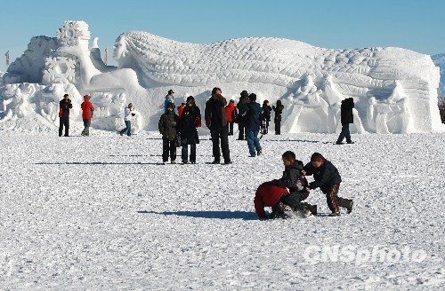 12月26日,众多游客在长25米、宽4米、高6米的巨型雪雕作品《雪之韵》前拍照、嬉闹。当天,新疆乌鲁木齐第七届丝绸之路冰雪风情在该市南郊一滑雪场隆重开幕,作为本届冰雪风情节主题雕塑的巨型雪雕作品《雪之韵》格外引人注目,吸引大批游客与之“亲密接触”。中新社发 刘新 摄