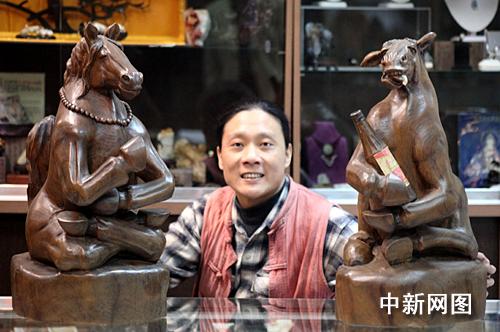 台湾轮椅上的木雕家林正发,身残志坚,十六岁就开始学习木雕,二十八年来刻马近马匹,功力深厚,被台北科技大学校长张天津誉为台湾雕刻界的雕马名家。图为林正发与他雕刻的木雕“醉马”和“坐禅马”。 摄影:陈立宇