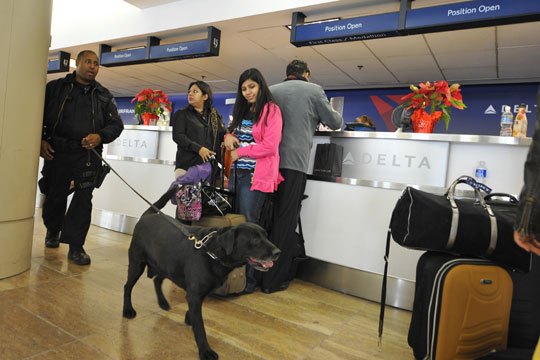 当地时间26日,在美国底特律发生乘客炸机未遂事件后,美国机场以及航空公司加强安全警戒。图为26日,洛杉矶机场搜爆犬在执行任务。