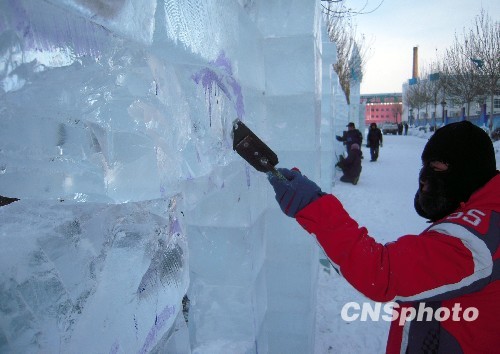 2009年12月27日,齐齐哈尔,人们在对冰雪艺术品进行最后完善。中国(齐齐哈尔)第八届关东文化旅游节将于12月28日盛妆登场。中新社发 王云龙 摄